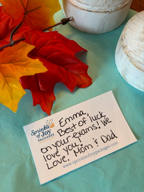 Sprinkle of Joy Packages was founded in the heart of Chester County, Pennsylvania by Carrie, a mom of two college students. What began as her way of sending love and encouragement to her daughters through thoughtful care packages has grown into a passion for helping others share joy and create connetions. Carrie is always happy to help make your gift feel extra special.Every package is created with care and can be customized to fit your needs—whether that’s highlighting school colors, adding a birthday celebration theme, or including special items you’d like to request directly. Our email is SprinkleOfJoyPackages@gmail.com Be sure to check back often! We’re always introducing new seasonal packages, and we’ll soon be featuring unique handpicked finds from local vendors to make your gifts even more meaningful.