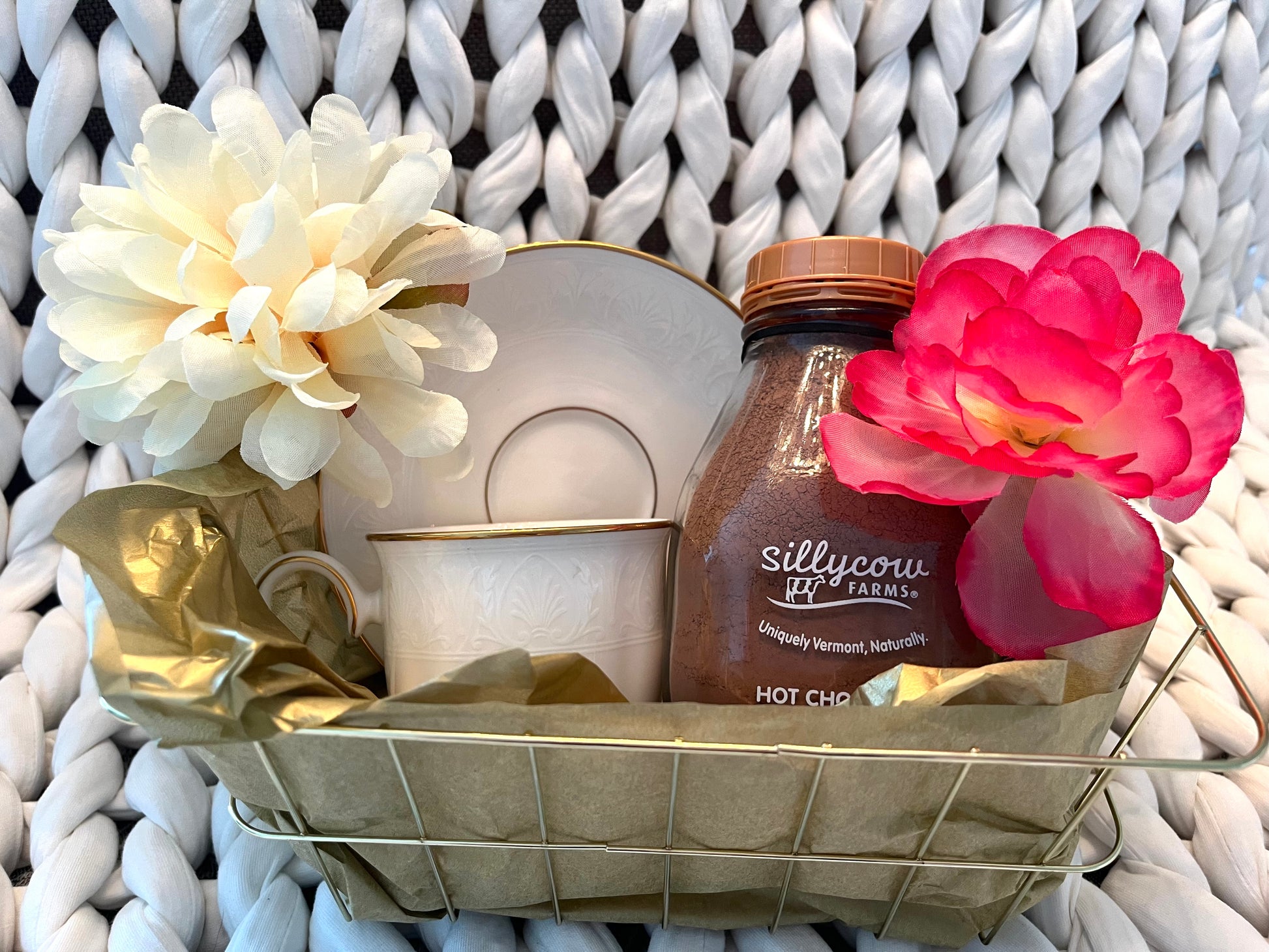 Put together your own basket sure to warm the heart! Choose a handpicked tea cup and saucer purchased at a local antique store and pair with your choice of Silly Cow Cocoa (free of major allergens), a 12-count box of Starbucks Pike Place Medium Roast K-Cup Coffee Pods, or 6 assorted tea bags. 2 packs of MadeGood mini chocolate chip cookies are also included. For shopping purposes, any fragile items will be bubble wrapped before packaged to protect them during shipping.