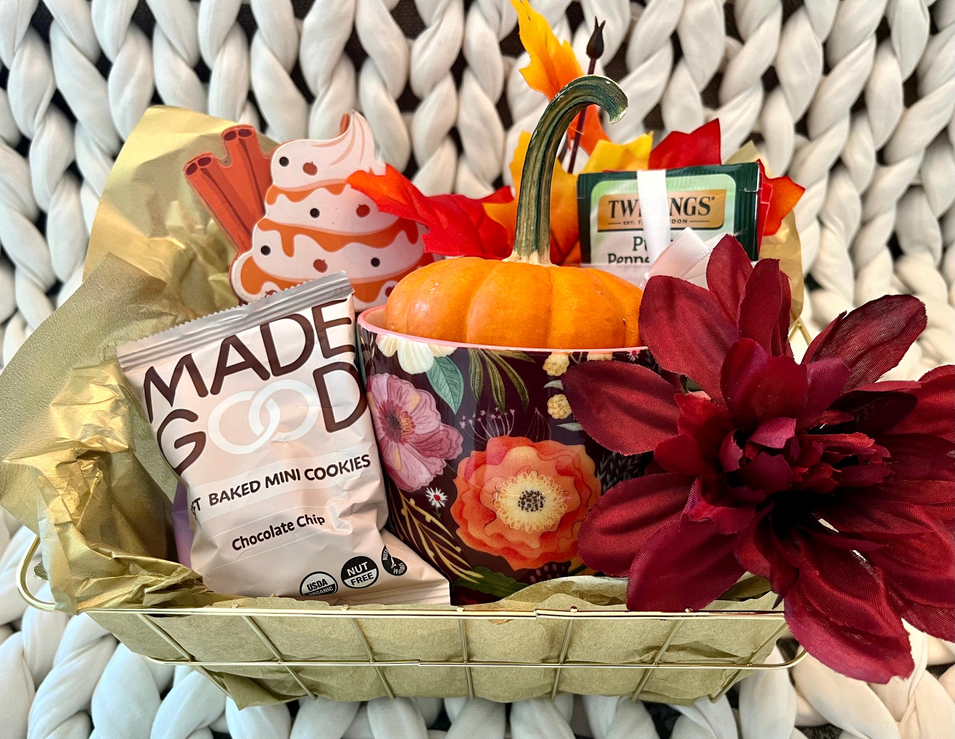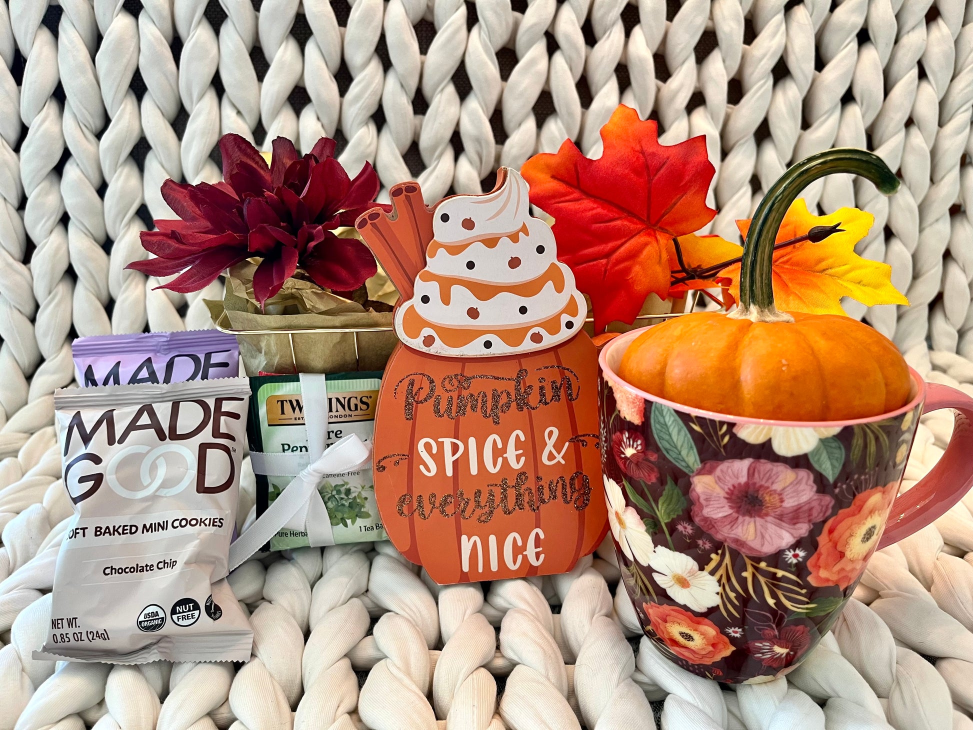 'Tis the Season for Pumpkin Spice! Includes pictured ceramic mug, wooden "pumpkin spice" sign shown, real mini pumpkin, 0.85oz pack of Made Good soft baked mini chocolate chip cookies, pack of Made Good soft baked mini double chocolate cookies, three peppermint tea bags, three English Breakfast tea bags, silk fall flower and silk fall leaves. Packaged in gold colored wire basket and wrapped in cellophane for delivery. Free shipping via USPS Priority Mail included.